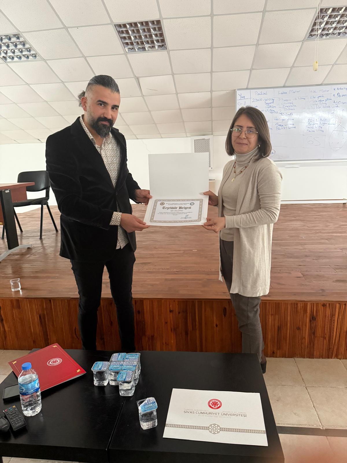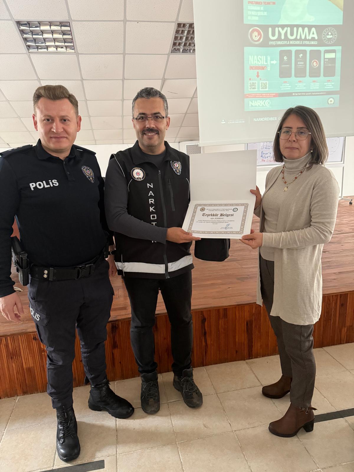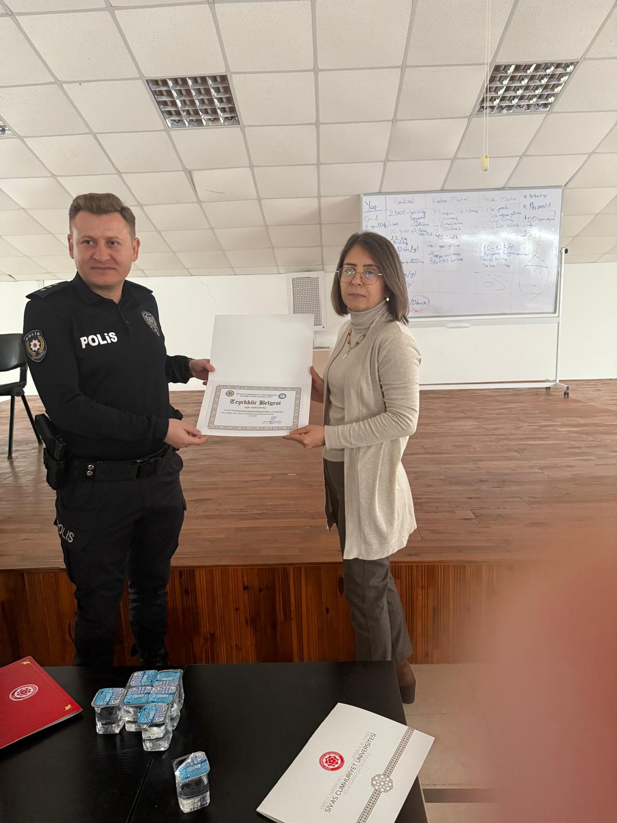 Programın sonunda, Suşehri Timur Karabal Meslek Yüksekokulu Müdürü Doç. Dr. Fatma Tok Yıldız, katkılarından dolayı İlçe Emniyet Müdürü Başkomiser Fatih Güzel'e ve Sivas'tan gelen konuşmacılar Ali Bertan ile Başkomiser Ümit Güney'e teşekkürlerini sunarak birer teşekkür belgesi takdim etti.